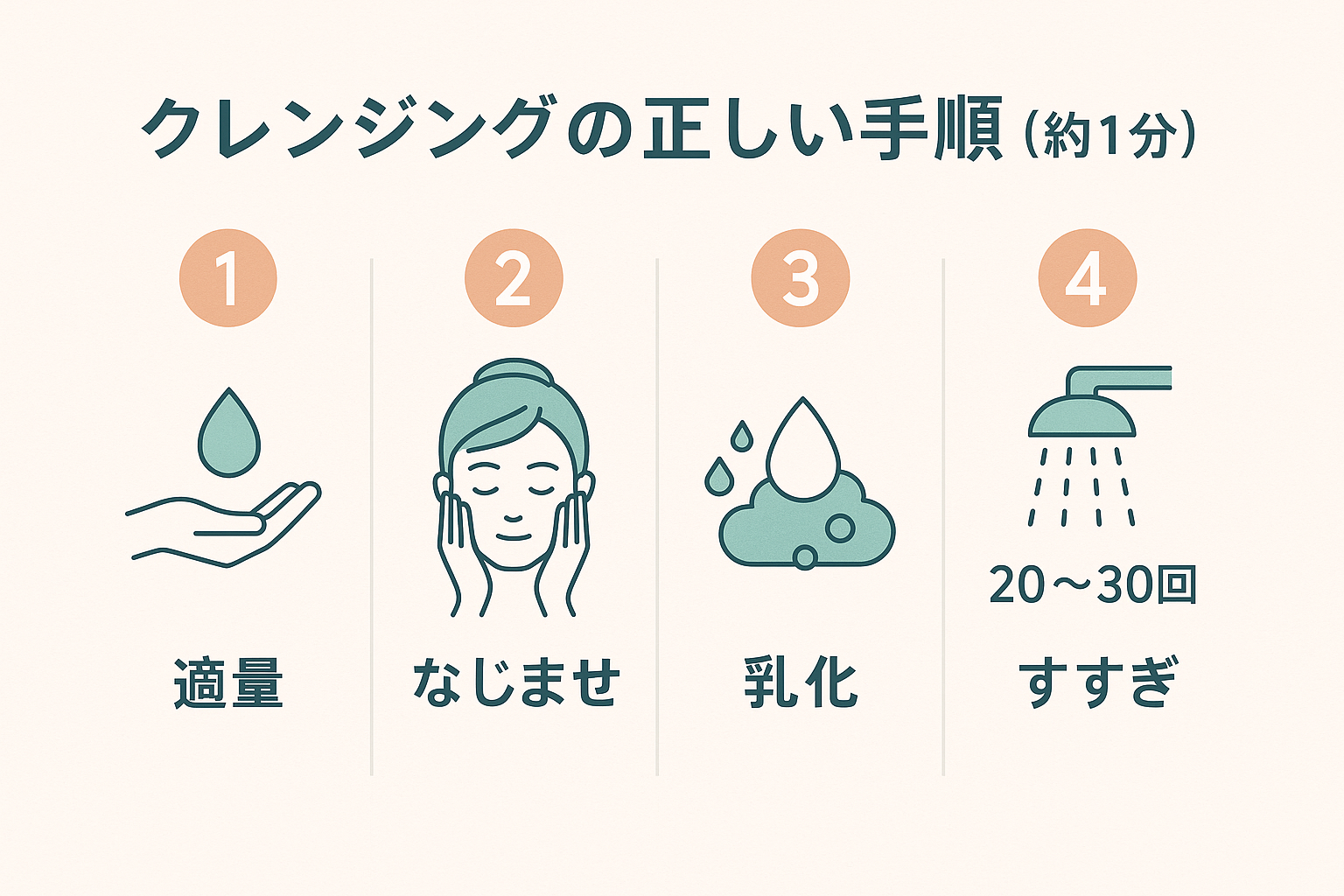 きめ細かい弾力泡が摩擦を減らします。ネットやホイッパーで泡を山盛りにし、肌の上を転がすイメージで洗いましょう。水温は手で「ぬるい」と感じる程度が目安。熱いお湯は乾燥と皮脂リバウンドを招きます。