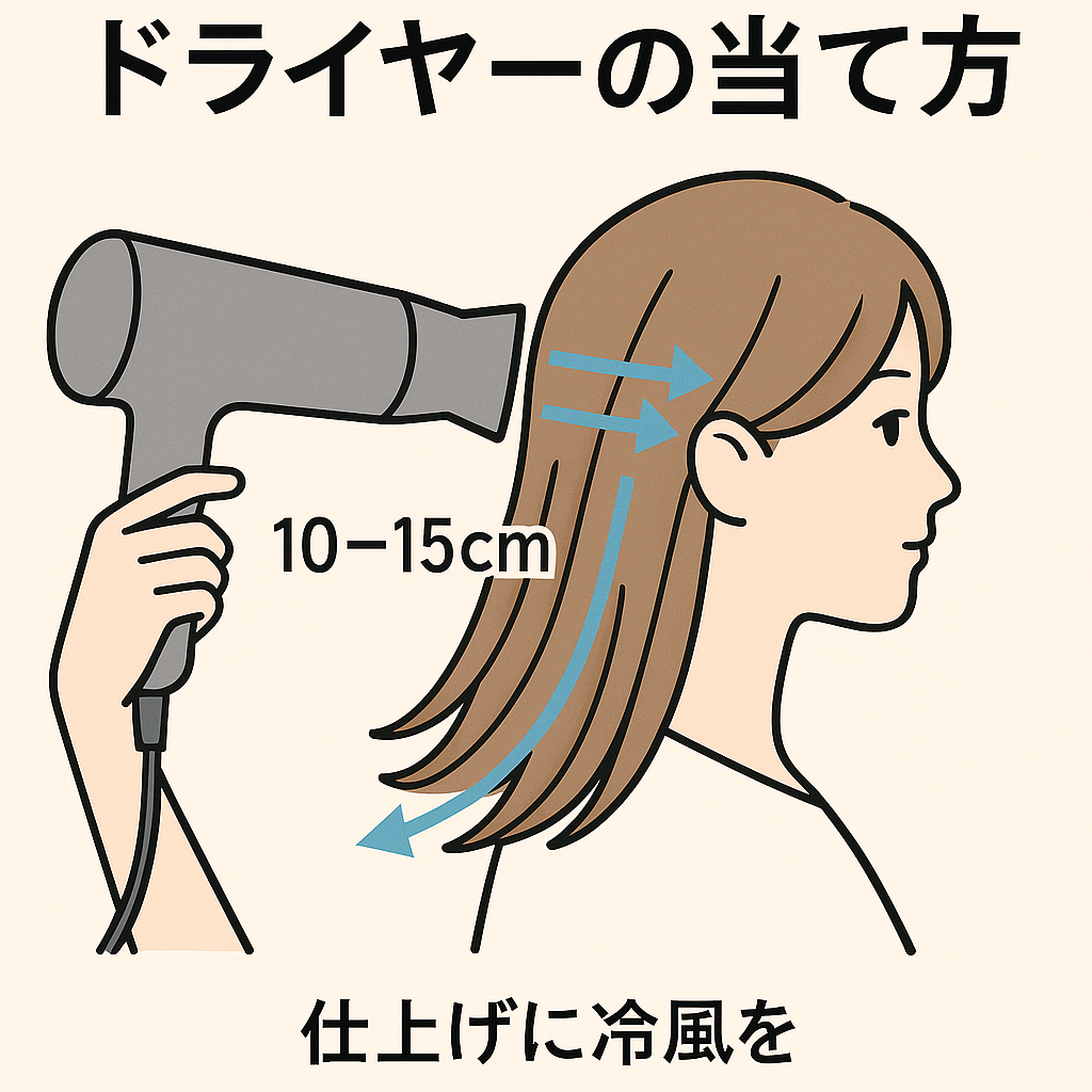- 5. ドライヤーの当て方:速く、近く、動かす
