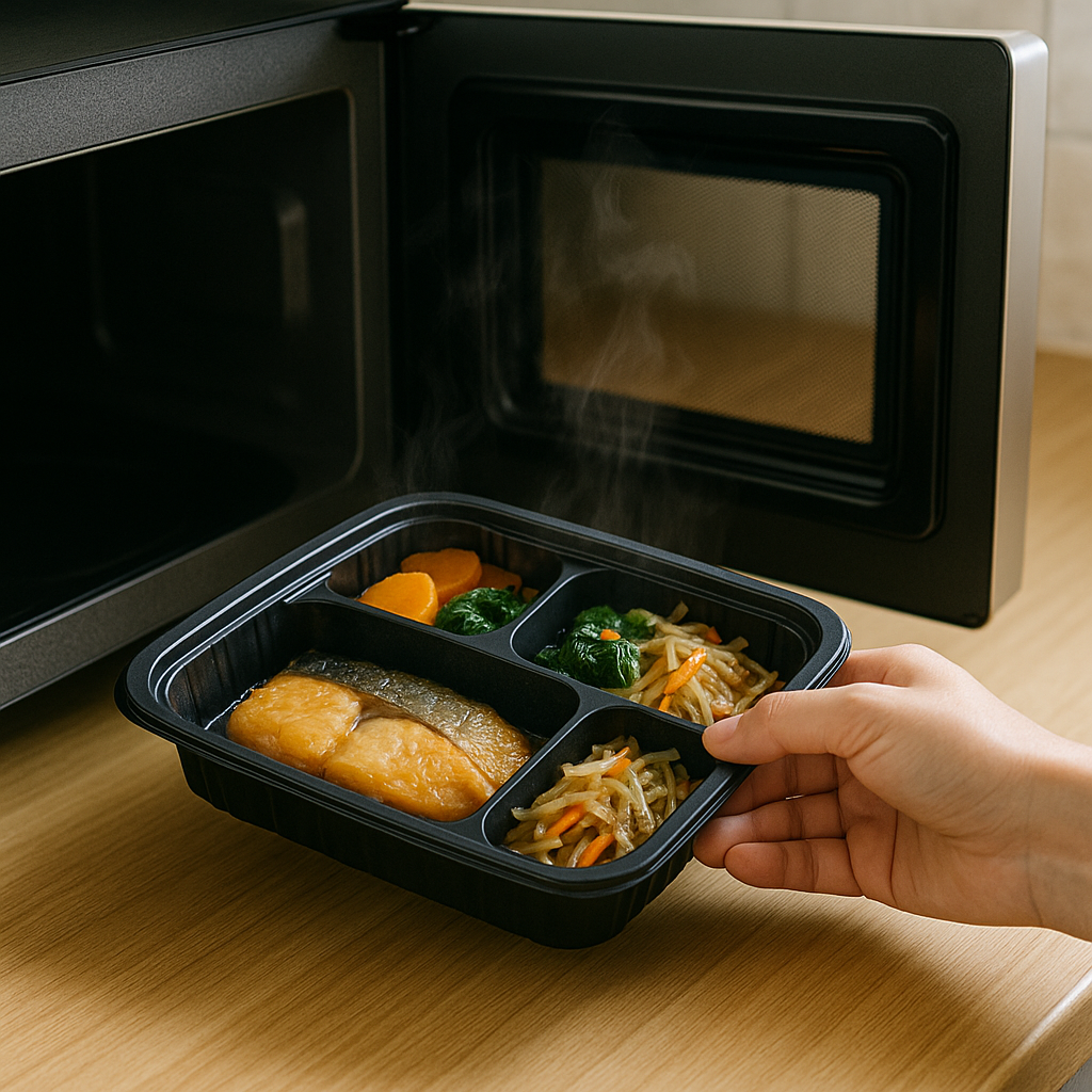 - 弁当を取り出して蒸気を逃がし、必要なら10〜20秒追加加熱。