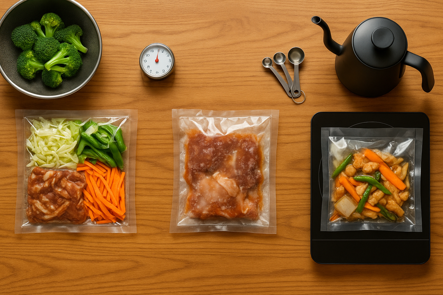 カット済み食材+調味だれ:包丁いらずで爆速。食感のばらつきは出やすいものの、初期の体力温存に最適。