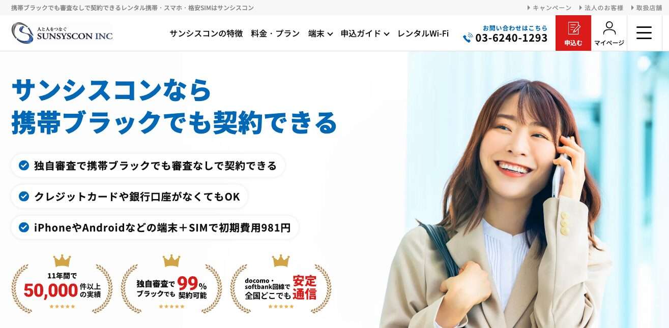 サンシスコンは、携帯契約の審査に不安がある人向けに、レンタル携帯・レンタルスマホ・格安SIMを案内しているサービスです。公式サイトでは、独自審査により携帯ブラックでも契約しやすい構成を打ち出しており、契約から6か月以上で個人名義への切替案内がある点も特徴です。