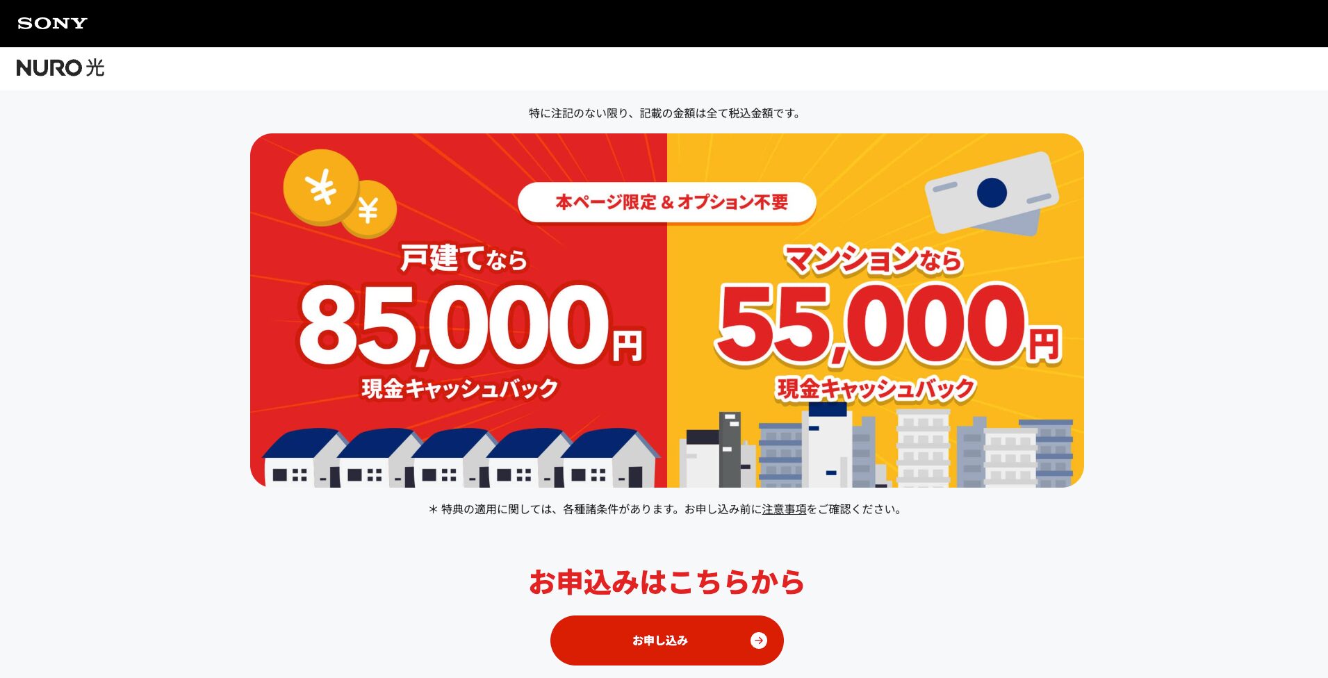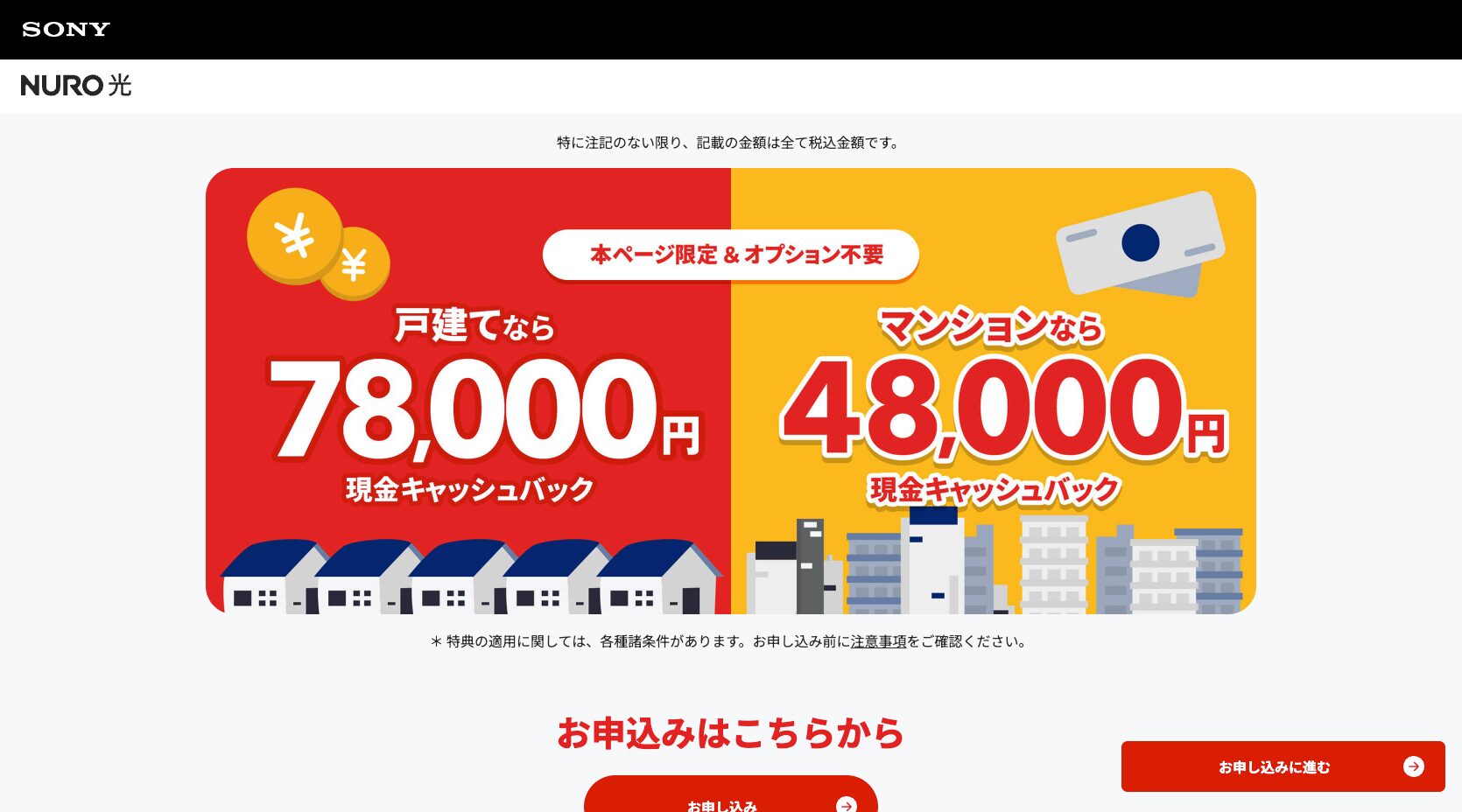提供エリア内で設備導入済みの建物ならマンションでも申し込み可能。建物単位の対応状況はNURO 光の申し込みページで住所検索して確認できる。