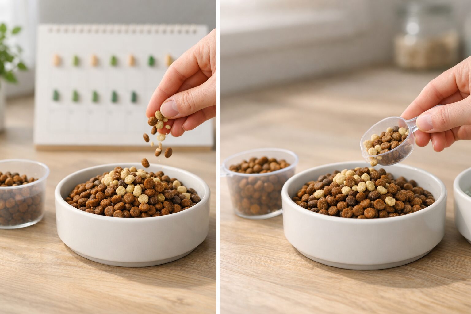 他のフードから切り替える場合は、今の食事に少しずつ混ぜ、2週間を目安に段階的に移行します。運動量や年齢、体型などで必要量は変わるため、給与量表を目安にしつつ3gから5gずつ微調整します。ドライは水分が少ないため、いつでも新鮮な水が飲めるようにしておきましょう。