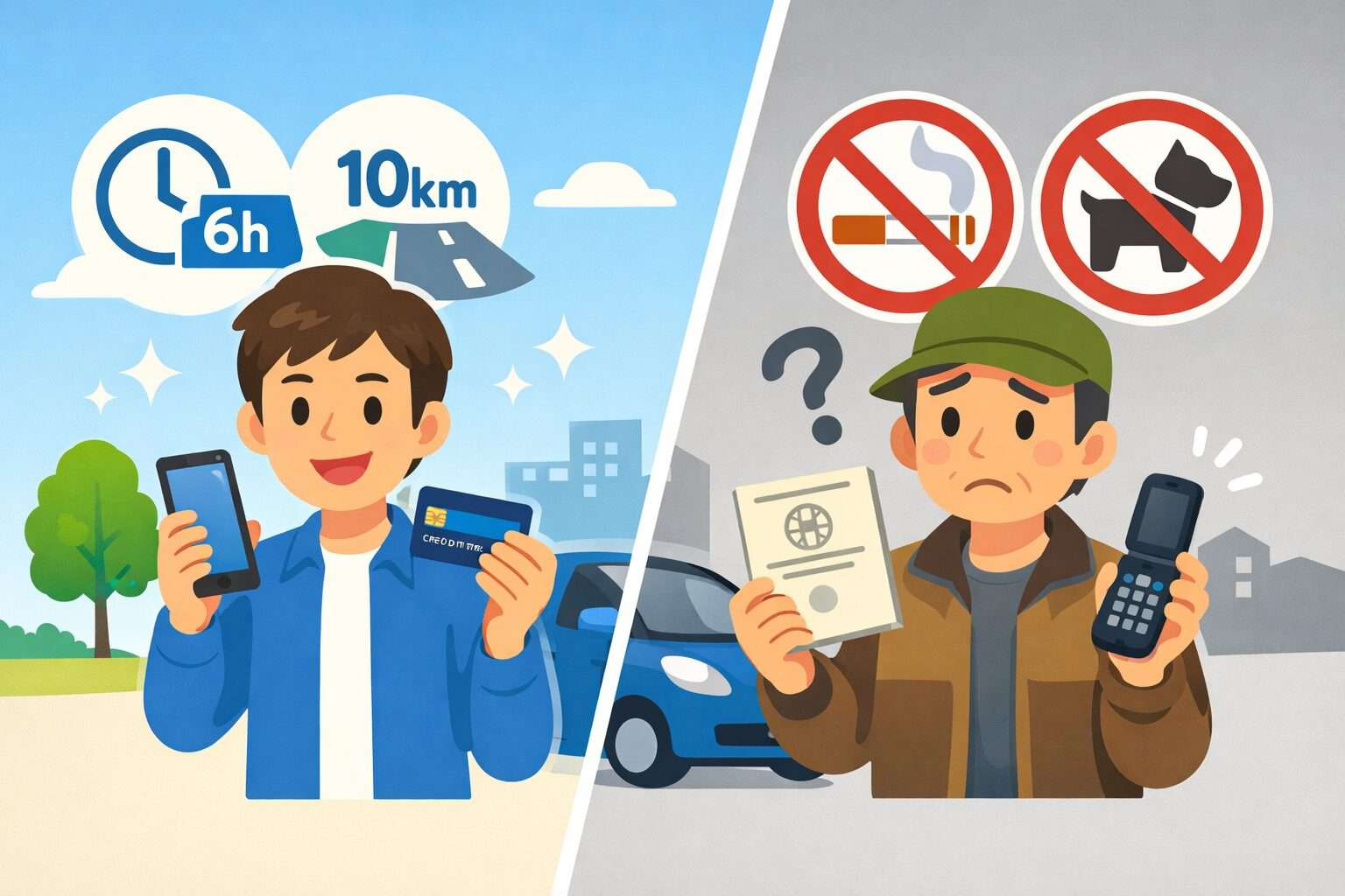 - 対象外:国際免許証は不可、スマホ以外は不可、原則禁煙(喫煙車あり)・ペットは原則不可(ペット可車両あり)など車両ごとの条件あり