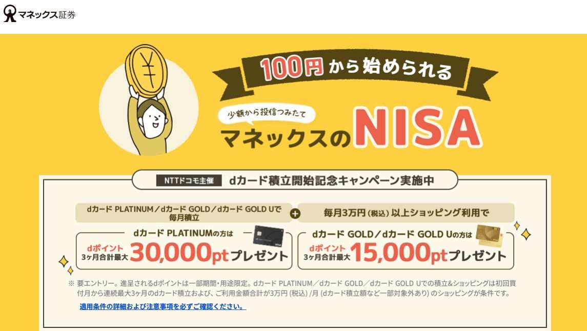 「NISAは気になるけれど、証券会社の違いがわからない」「口座開設でつまずきそう」。そんな不安があるなら、マネックス証券は最初の一歩を整理しやすい選択肢です。dポイントとの連携や、NISAを同時に申し込みやすい流れが見えやすく、投資初心者でも次に何をすればいいか迷いにくいのが魅力。最初から完璧を目指さなくても、口座開設のしやすさと少額からの積立イメージまで見渡せるだけで、気持ちはかなり軽くなります。
