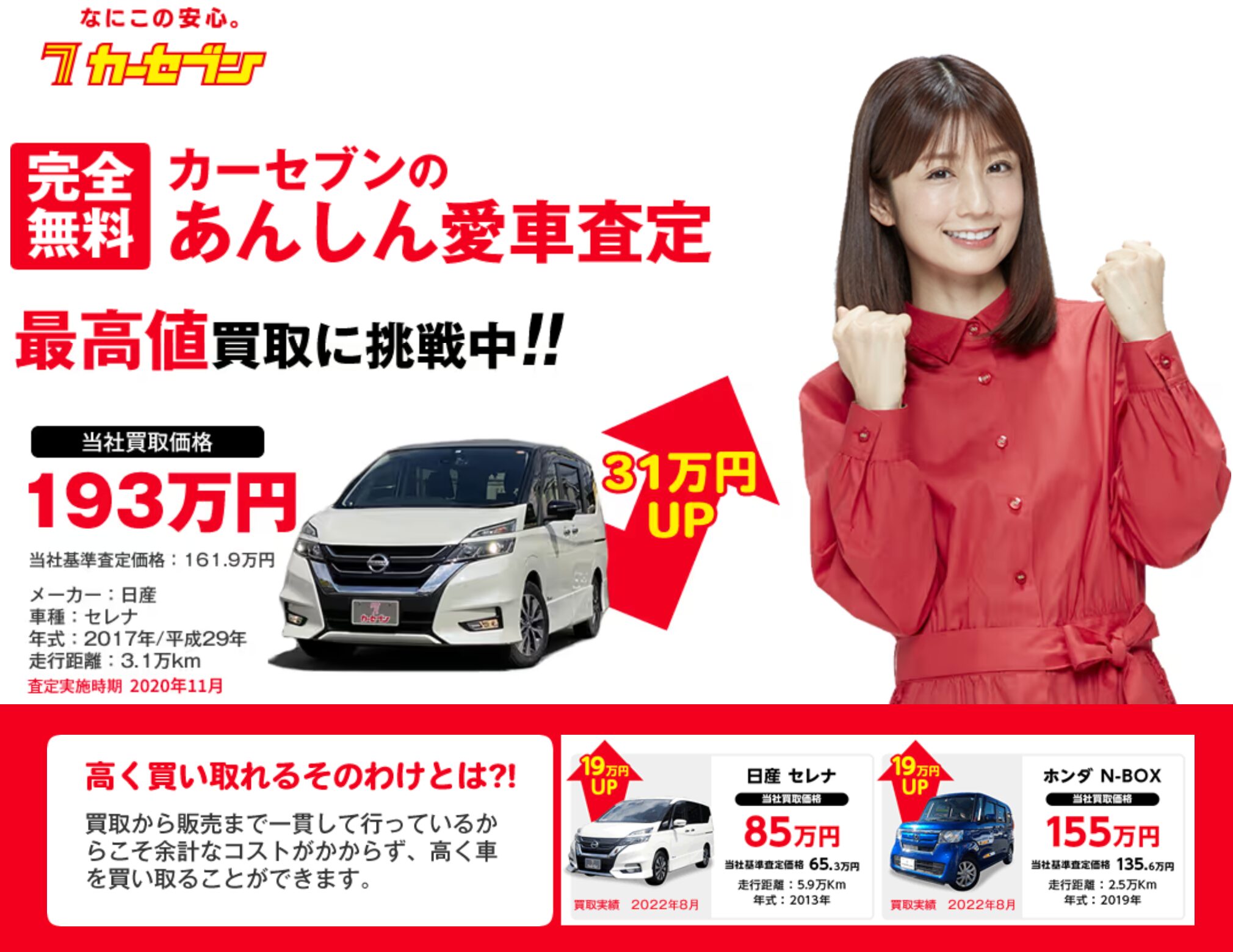 カーセブンのLPでは、安心宣言だけでなく査定例も具体的に見せています。たとえば日産セレナは、他社査定額161.9万円に対して193万円、31万円UPの掲載例があります。