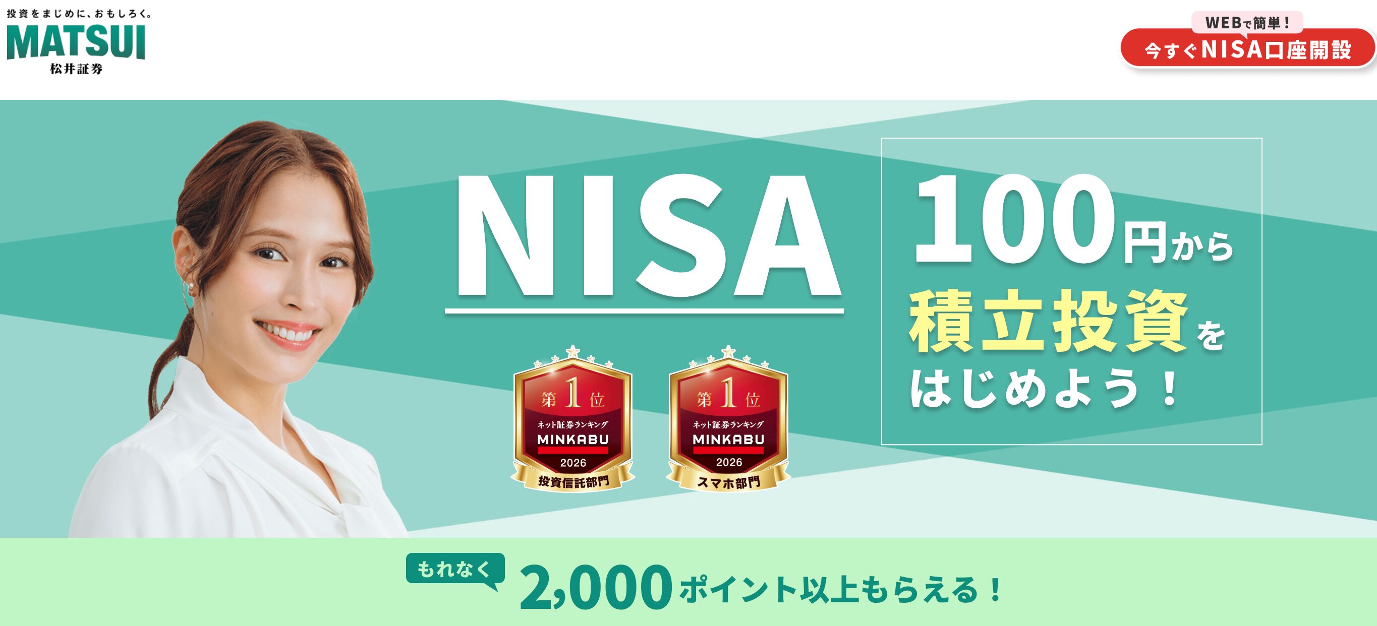 現在、新規で総合口座およびNISA口座を開設し、簡単なクイズに正解するだけで、最大2000ポイントがもらえる応援プログラムなどの条件が用意されています。